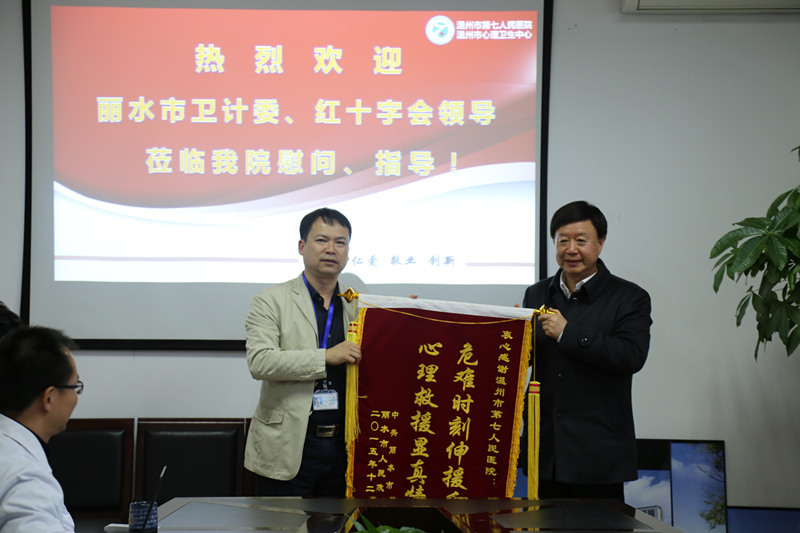 12月9日,麗水市衛(wèi)計(jì)委副主任蔡承俊、辦公室副主任樓陳基,紅十字會(huì)心理救援隊(duì)副隊(duì)長(zhǎng)張巖受麗水市市委市政府委托,在溫州市衛(wèi)計(jì)委副主任陳樂(lè)慧的陪同下,到市七醫(yī)親切慰問(wèn)參與里東災(zāi)情心理救援工作的心理援助隊(duì)隊(duì)員,并送上錦旗和感謝信。市七醫(yī)院長(zhǎng)林小東,書(shū)記胡立榮、副院長(zhǎng)張偉及相關(guān)科室負(fù)責(zé)人陪同慰問(wèn)。